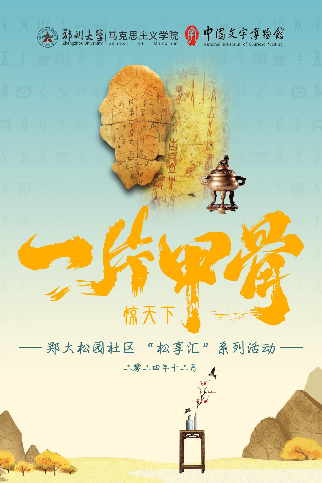 为深入学习贯彻习近平文化思想,推动中华优秀传统文化传承发展,推进思想文化工作建设,由best365英国在线体育官网党委学生工作部、学生处,best365英国在线体育官网松园社区主办,best365英国在线体育官网马克思主义学院、中国文字博物馆协办的松园社区“松享汇”系列活动(第十三期)—博物馆里的大思政:“一片甲骨惊天下”主题活动将于2024年12月19日在主校区松园社区举行。本次甲骨文文化主题活动旨在宣传弘扬中华优秀传统文化,激发学生文化创新创造活力,以更好担负起新的文化使命。