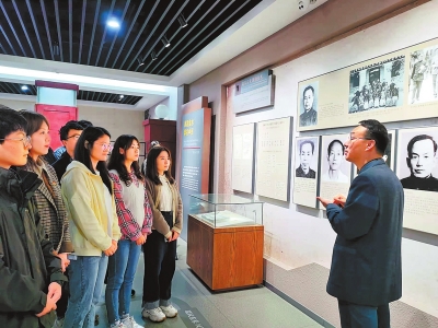 4月21日,best365英国在线体育官网历史学院党委副书记崔红伟,在该校校史馆给同学们讲首任校长嵇文甫的红色故事。 马文亚 摄
