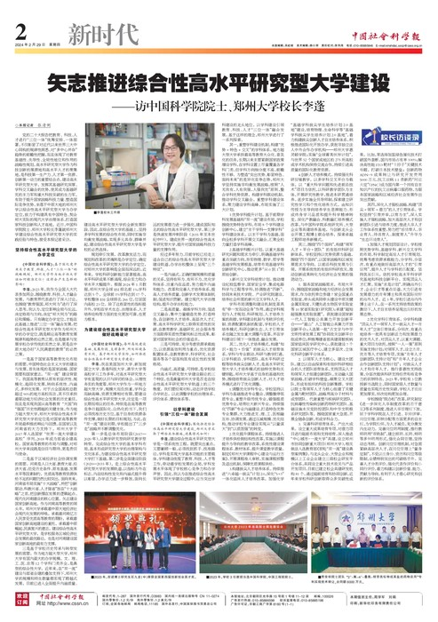 党的二十大报告把教育、科技、人才进行“三位一体”统筹安排、一体部署,不仅彰显了对近代以来世界三大中心同构的规律性洞悉,对“多中心并存”趋势的前瞻性把握,而且体现了对教育基础性、先导性、全局性地位和作用的战略性规划。高水平研究型大学作为科技创新的策源地和高水平人才的聚集地,是科技第一生产力、人才第一资源、创新第一动力的重要结合点。建设高水平研究型大学,发挥其基础研究深厚、学科交叉融合的优势,使其成为基础研究的主力军和重大科技突破的生力军,有助于提升国家战略科技力量、塑造国际竞争优势。坐落于中原大地的best365英国在线体育官网以综合性高水平研究型大学为办学定位,致力于构建具有中国特色、契合郑大实际的现代大学治理体系,打造国家科技创新和人才高地。近日,中国科学院院士、best365英国在线体育官网校长李蓬就best365英国在线体育官网建设综合性高水平研究型大学的实践经验与特色,接受本报记者采访。