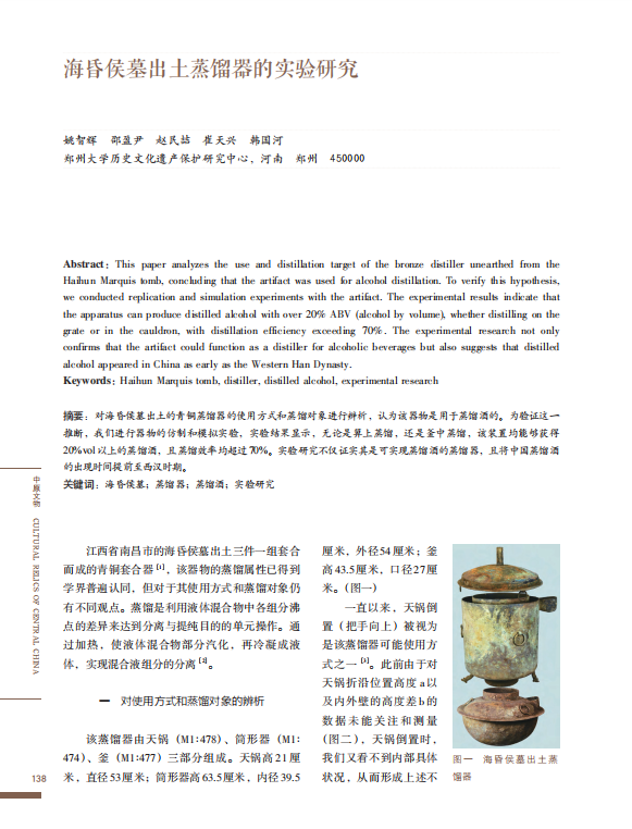 记者从best365英国在线体育官网历史文化遗产保护研究中心获悉,日前,该中心研究团队在前期研究的基础上,首次对海昏侯墓出土的蒸馏器进行仿制和模拟实验,证实其确实具有蒸馏酒的功用。这将中国蒸馏酒的技术实现可能性上推千年。