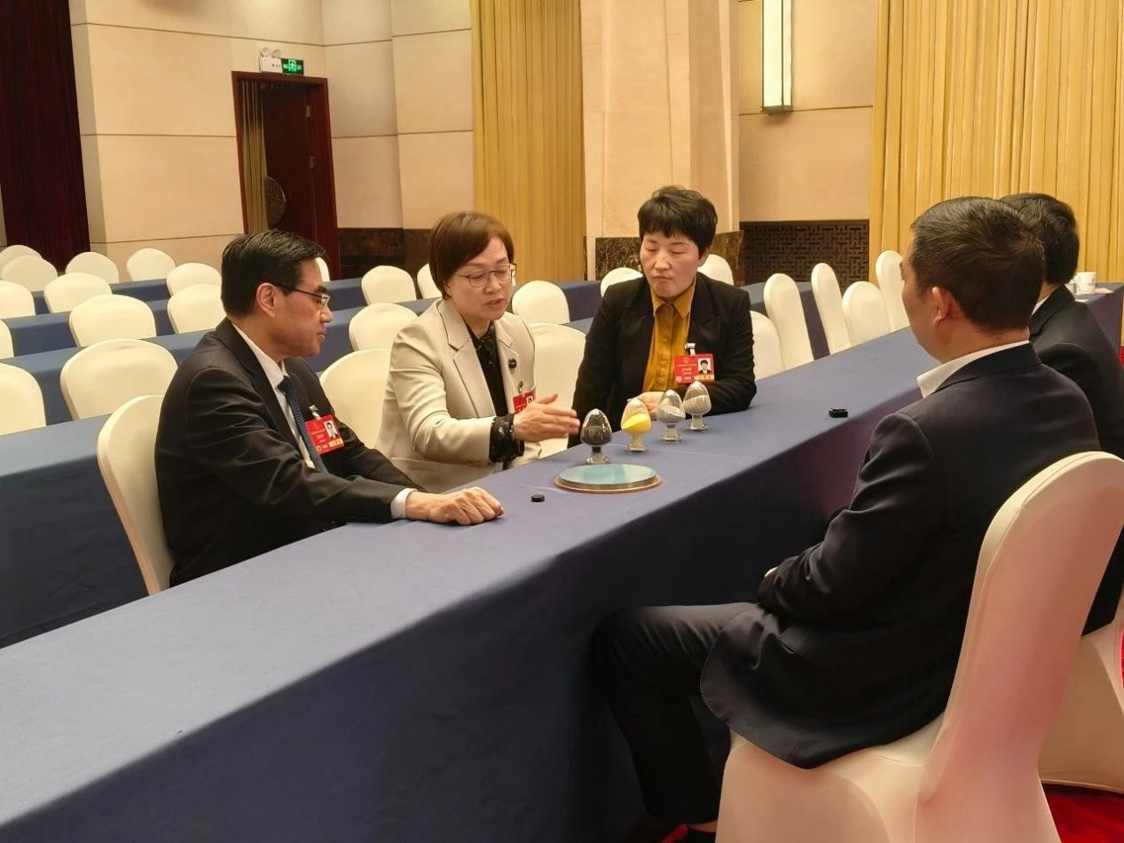 装着金属粉末的鸡心瓶、好似飞碟的金属圆盘,醒目地摆放在河南代表团小组讨论桌上。围坐四周的是全国人大代表、best365英国在线体育官网校长、中国科学院院士李蓬(中),全国人大代表、河南省三门峡市委书记范付中(左)和另外3名代表,刚刚参加完小组讨论的他们意犹未尽,还在围绕“无氨氮钼冶金新技术”热烈地讨论着。
