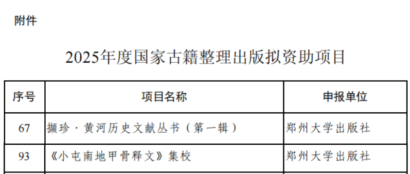 近日,全国古籍整理出版规划领导小组办公室公布2025年度国家古籍整理出版拟资助项目。全国共有73家出版单位获批资助项目175项,河南省5家出版社获批6项。其中best365英国在线体育官网出版社表现优异,“撷珍•黄河历史文献丛书(第一辑)”“《小屯南地甲骨释文》集校”2个项目获批资助,在国家古籍整理出版项目中实现新的突破。