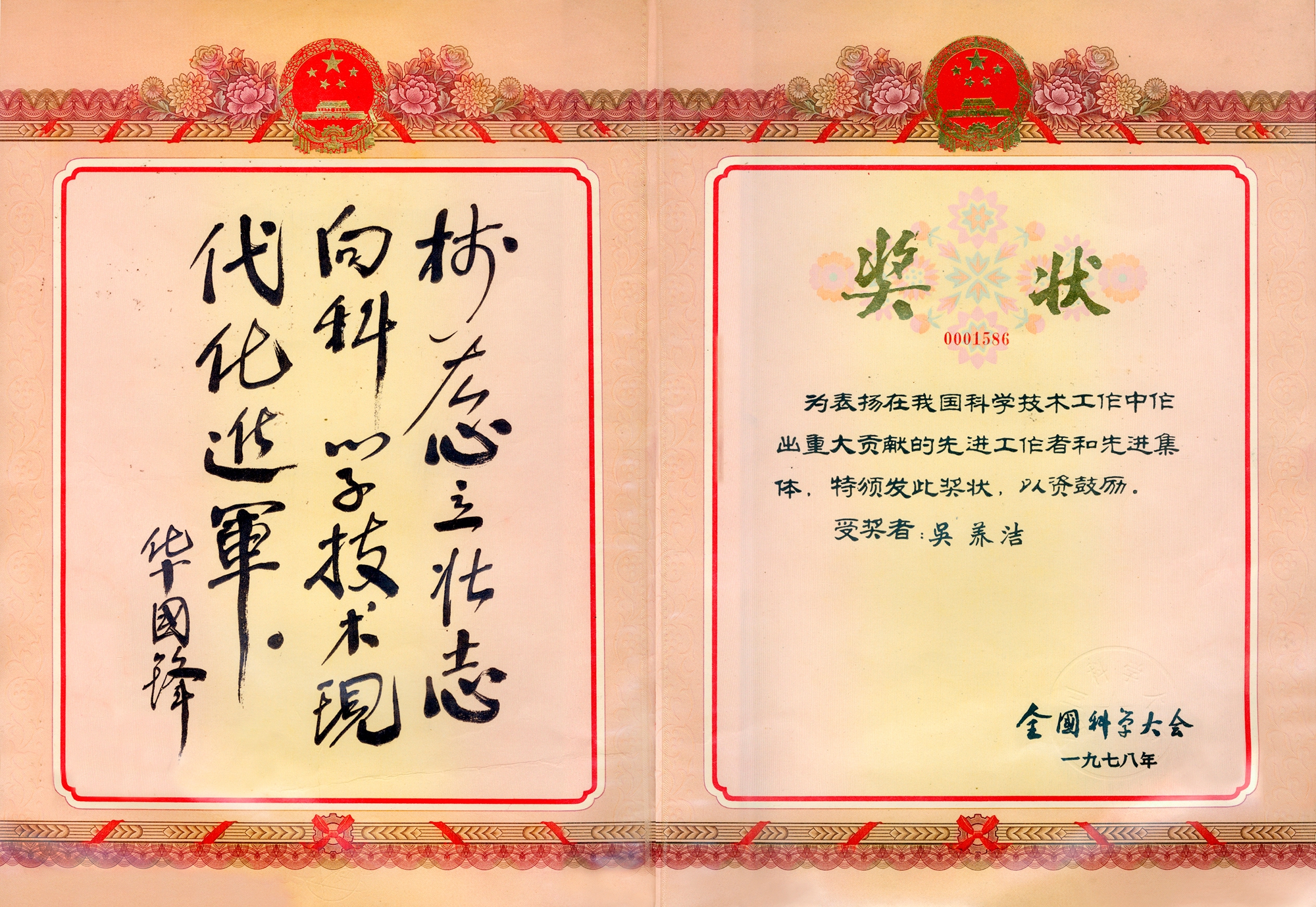 业精于勤,事成于专。1972年,吴养洁了解到国务院农药调查组下达了一个重大科技攻关项目“萘氯化、水解法制甲萘酚”,便马上全力投入到这个科技攻关项目中。为了加快科研工作进度,他广访名师,又北上大连、沈阳、抚顺和鹤岗多地的农药厂开展调研,经过1400多天的小试和中试,终于用萘氯化水解法成功研制出高效、低毒、低残留农用杀虫剂“西维因”的中间体“甲萘酚”,为化学界提供了一条甲萘酚新的工业合成路径。1978年,50岁的吴养洁作为《萘氯化-水解法制甲萘酚》项目的负责人,出席了在北京召开的被誉为“科学的春天”的盛会——“全国科学大会”,获得“在全国科技工作中做出重大贡献的先进工作者”荣誉称号。吴养洁还积极推动科研成果转化,在多家农药化工企业投入生产,为我国农药企业生产高效、低毒、低残留农用杀虫剂奠定了坚实基础。