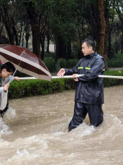 暴雨如注,水深路险,工作人员户航、任彬带领安保人员和学生志愿者,跳入了洪水中,在水流湍急处,用消防水带为师生拉起了“安全绳”,筑起了“生命线”。鞋子冲走了,就光脚;脚扎破了,雨水冲洗下继续奋战。受助学生纷纷表示:“水很深,风很大,因为有你们,我们不怕”。