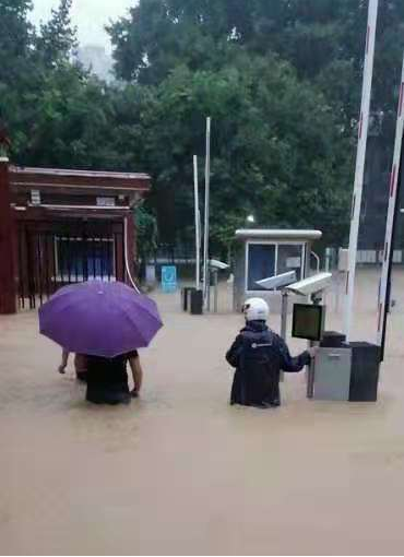 哪里有困难,哪里有需要,哪里就有安保人员的影子。主校区北门岗亭被雨水冲到路边,安保人员积极进行复位;大水把窨井盖冲错位,安保人员第一时间排查隐患恢复原位,并在塌陷区域,拉起警戒线;自行车凌乱地倒在地上,是安保队员逐一归位并摆放整齐;为防止大灾之后有大疫,安保人员对校园大门进行了全面消杀……他们的身影忙碌在校园里,同时也深深地镌刻在师生心中。