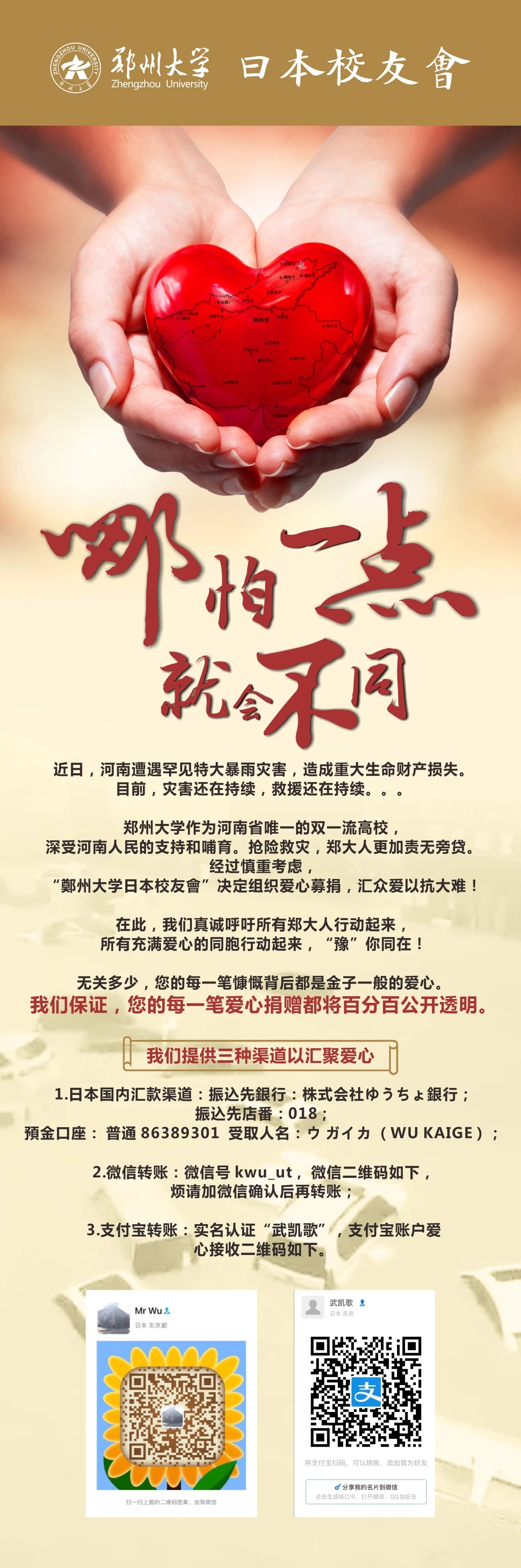 使人感动的不仅仅有郑大校友,还有众多来自社会各界的爱心人士。华盛顿校友会收到了一位七十多岁老先生的捐款,老先生看到新闻后,主动找到华盛顿校友会捐赠1000多美元,他说:“我虽然不是河南人,也没有在best365英国在线体育官网读过书,但是我特别喜欢河南这个地方。”远在日本的材料科学与工程学院2006级校友武凯歌看到新闻后焦虑万分,他想“一定要做点什么,哪怕一点点儿,就会不同!”他率先提出为家乡、为母校捐款的提议,日本校友会(筹)负责人迅速响应,立即启动募捐筹划。台湾高雄大学法学院杨戊龙教授在了解郑州灾情之后,很是挂念,“作为老师的本能,想到可能有学生需要帮助。”于是,他主动联系到best365官网法学院郑磊老师,向best365英国在线体育官网捐款10000元,希望帮助郑大学子渡过难关。