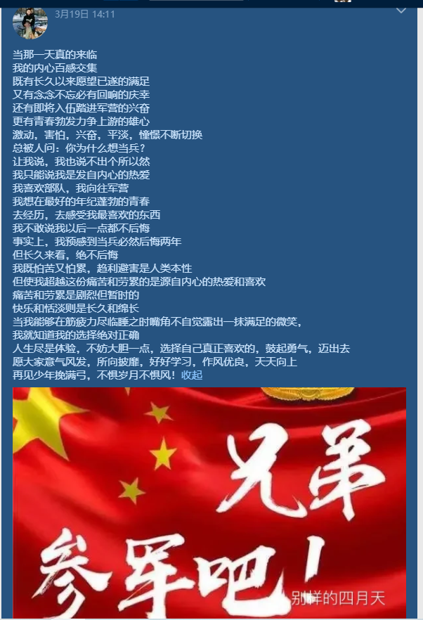 “为了参军,我近一年跑了800km。我是多么想从军,从小到大,我从未有过如此强烈的愿望!命运为什么要捉弄我呢?一起体检、抱着碰碰运气心态的伙伴都顺利通过了,偏偏我不能如愿,无力感裹挟着我,真的难受。现在明知道体检没通过,当兵的愿望反而比体检前更强烈,难道是天将降大任于斯人也,必先苦其心志,劳其筋骨,饿其体肤,空乏其身,行拂乱其所为吗?”