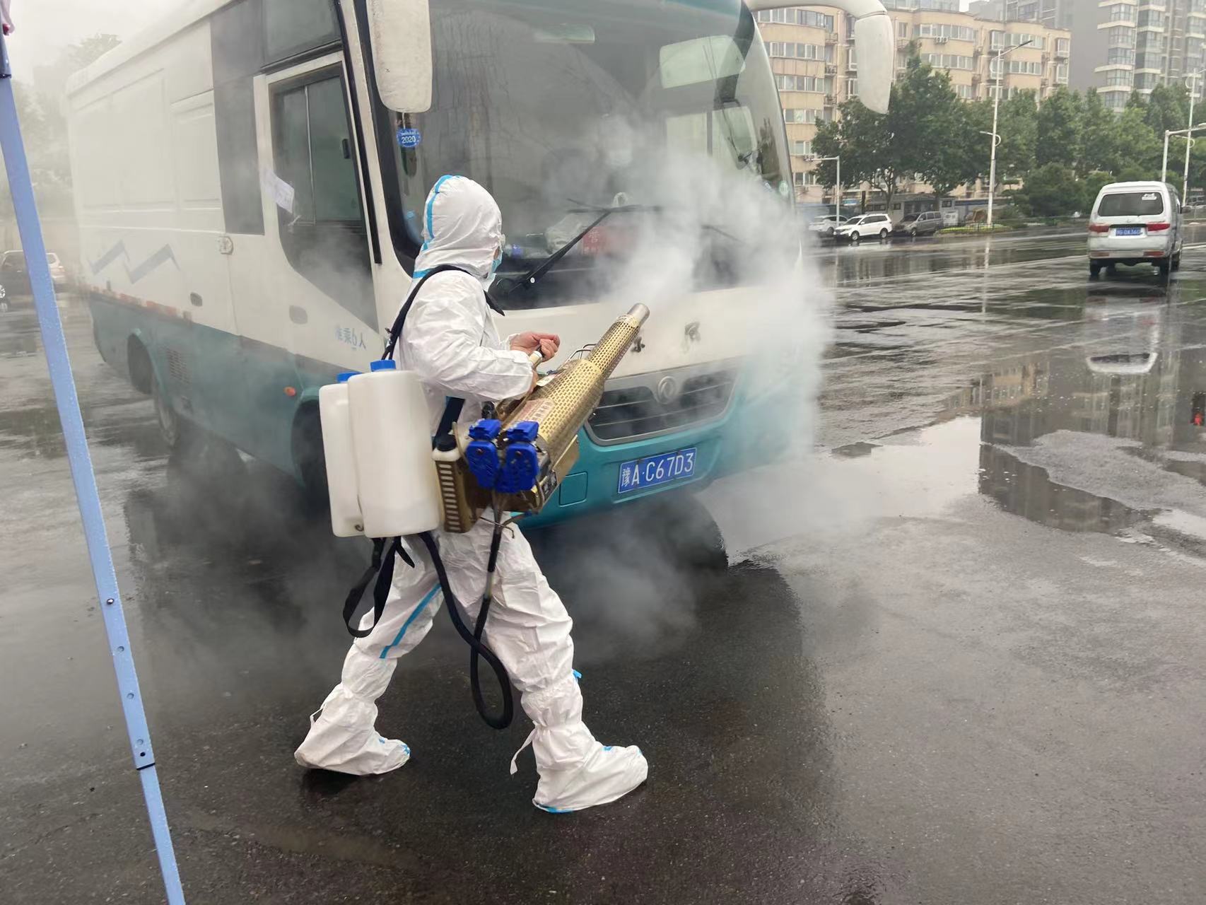 主校区北大门是物资运送的重要通道,早上6点队员们已经穿上防护服、拿上迷雾机对车辆进行车体消杀,一日三批轮班工作。师赛、鲁东东等人从早上6点到晚上11点是“常驻队员”,协调车辆、等待消杀、有序进校、限时出入,“这是入校第一道关口,我们必须把好”。