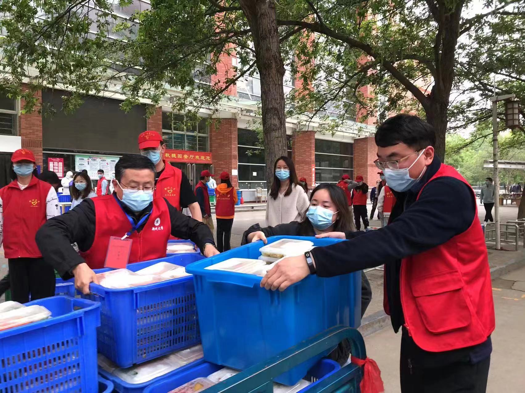 由于禁止堂食,烹饪好的饭菜还需要打包、装箱和售卖。对学校食堂,后勤集团实施领导分片,支部包干,每栋食堂楼平均12-15名志愿者,5万名学生的一日三餐就在志愿队员们的接力中,流水作业打餐、装箱有序运转、售饭熟练开展,每日三餐准时出现的志愿者让饭菜供应有了保障。从后厨到前厅的70米,队员赵斌、孙政等人走出了2万步;排队就餐人员拥挤,队员李岗、赵亮等人拿上喇叭不停提醒同学们“做好防护、不要拥挤”“留出进出通道”,顾不上喝水的他们到了晚上嗓子已经暗哑。