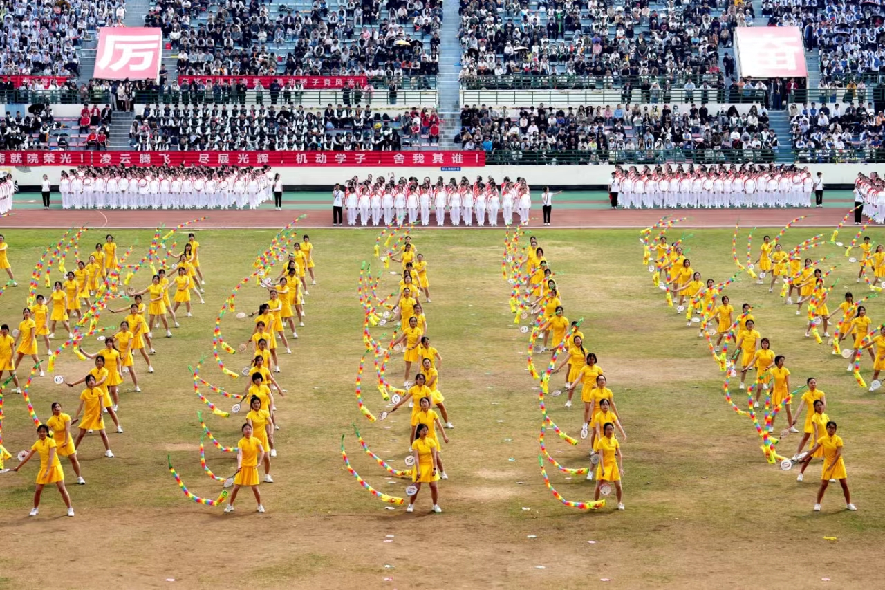一年一度的校运会已经圆满落幕,翘首以盼的开幕式,以超出预期的惊喜带来了空前的视听体验,精彩纷呈、惊喜连连。记忆尤其深刻的,是师生共同努力精心准备的大型团体操表演。400余名男生带来的武术表演《龙武传承》、450余名学生呈现的跆拳道表演《坚韧不拔》、300余名女生展示的柔力球表演《凝心聚力》、800余名女教职工带来的健美操表演《灼灼芳华》轮番登场,为观众带来一场视觉盛宴。气势磅礴的宏大场面、整齐划一的一招一式、设计新颖的造型变换,赢得阵阵掌声,欢呼与赞美之声响彻云霄。