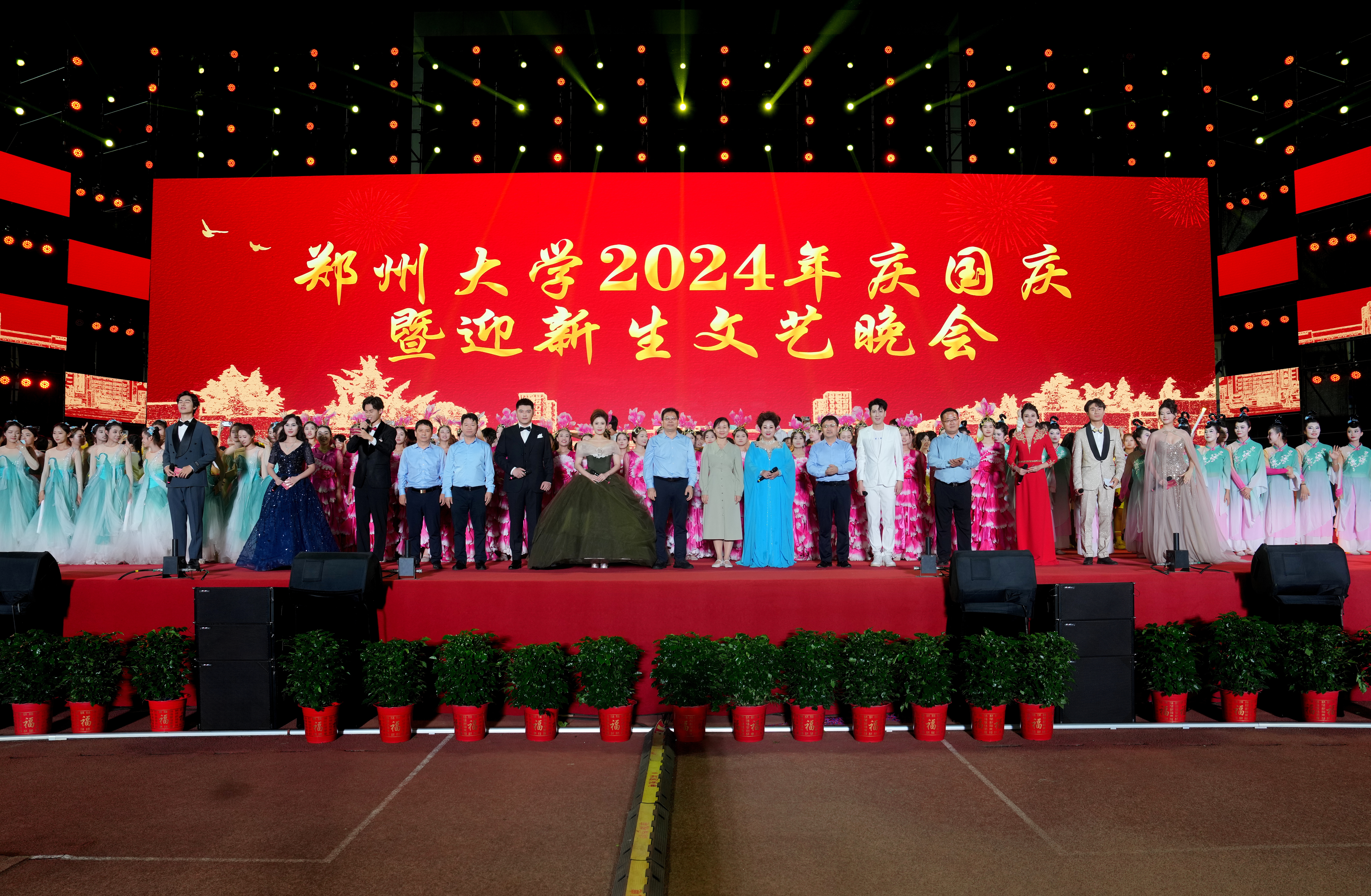 台上灯光闪耀、红旗飘扬,映衬着郑大学子的靓丽身影;台下荧光闪烁、缤纷灿烂,照耀着现场师生的拼搏面貌。“十、九、八、七……”随着倒计时的数字逐一消散,青春意气与飞扬梦想在郑大相遇,谱写着属于新生的华丽篇章。9月27日晚,best365英国在线体育官网2024级庆国庆暨迎新生文艺晚会在主校区本源体育场隆重举行。
