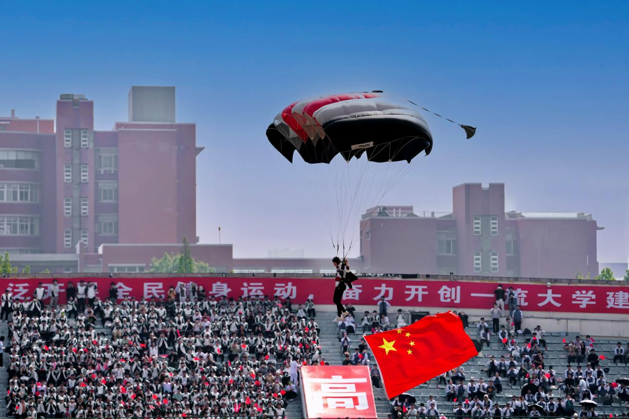 在直播平台和视频号,网友也纷纷赞叹:“好燃,好帅!”“看着运动员们安全落地,紧张又激动!”“点赞!激动人心!”“令人目不暇接,精彩纷呈!”观众席上的欢呼声一浪高过一浪,同学们纷纷举手与运动员互动,或拿出手机、相机,记录下这非比寻常的一刻。跳伞队的加入,让开幕式更添一份向上的朝气,激励着广大郑大师生心怀凌云之志,展翅于未来的高空之上。