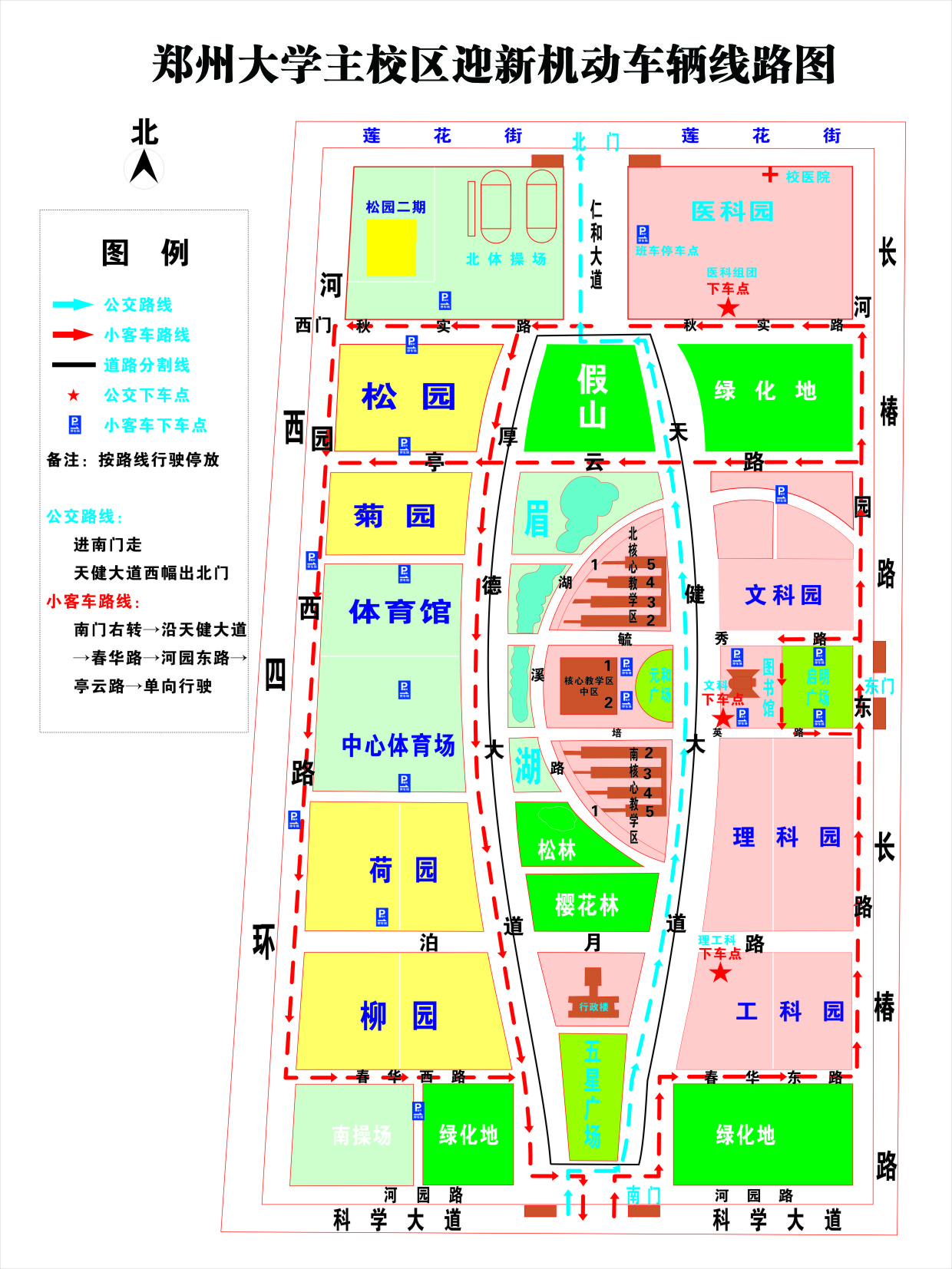 (五)医科新生车辆:在医学组团广场下车,到院(系)办理完报到手续后,车辆沿秋实路、河园西路到学生宿舍区。