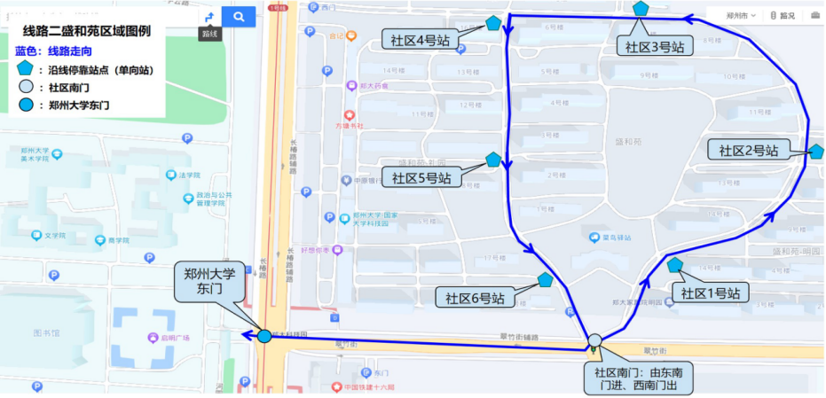 线路二:盛和苑内部道路、翠竹街、河园路(郑大东门)、毓秀路、天健大道、河园路(郑大南门)、厚德大道、秋实路、天健大道、培英路。
