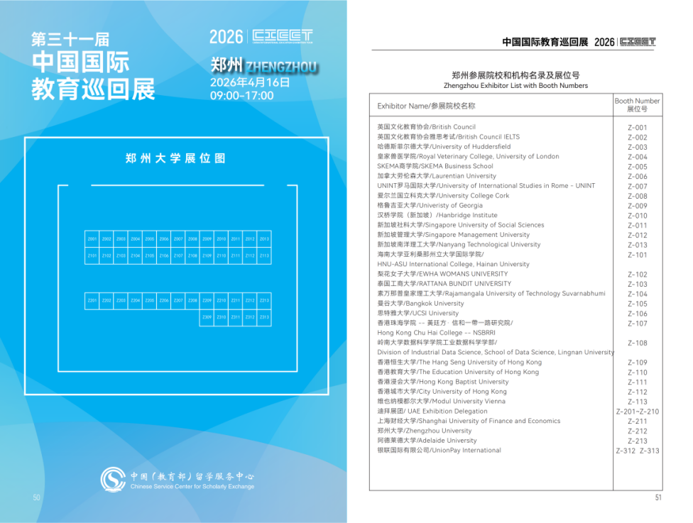 为提升国际化办学水平,拓宽师生国际视野,同时为中原地区广大学生和家长搭建权威、便捷的国际教育交流平台,由中国(教育部)留学服务中心主办、best365英国在线体育官网承办的“2026中国国际教育巡回展(郑州站)”将于4月16日在best365官网主校区举行。届时将有来自全球20余个国家和地区的近百所顶尖院校及教育机构齐聚郑大,带来一场集留学咨询、平安留学、学历认证、就业指导于一体的“全周期”服务盛宴。